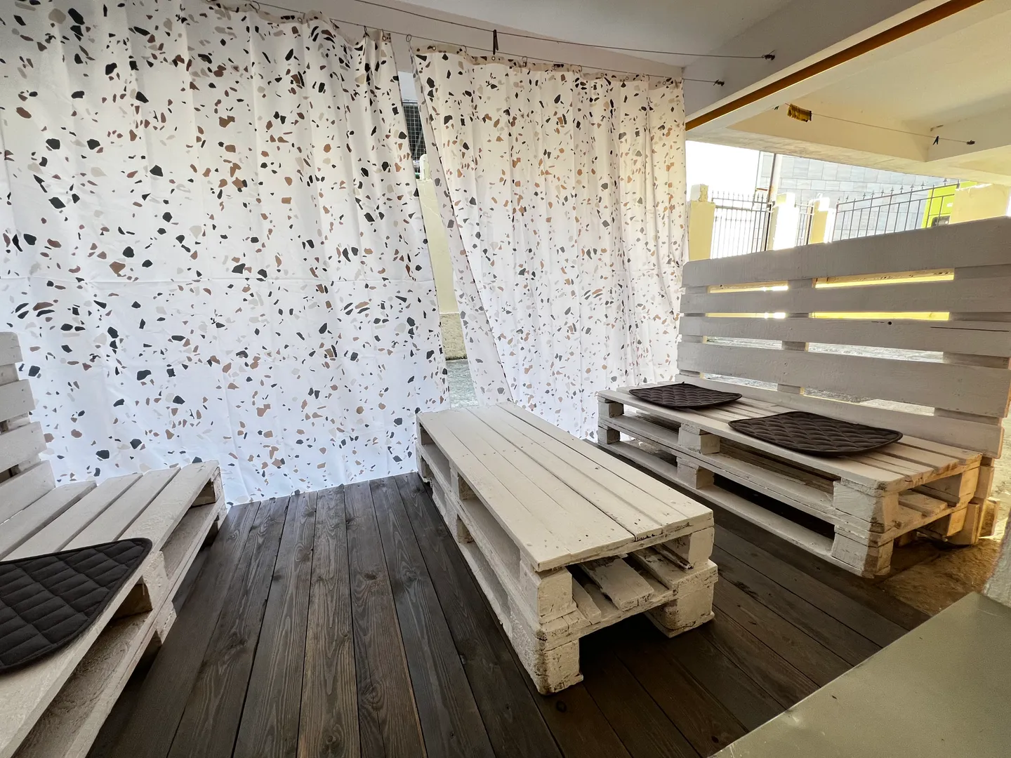 Квартира с выходом на прилегающую закрытую территорию, есть уличная мебель.