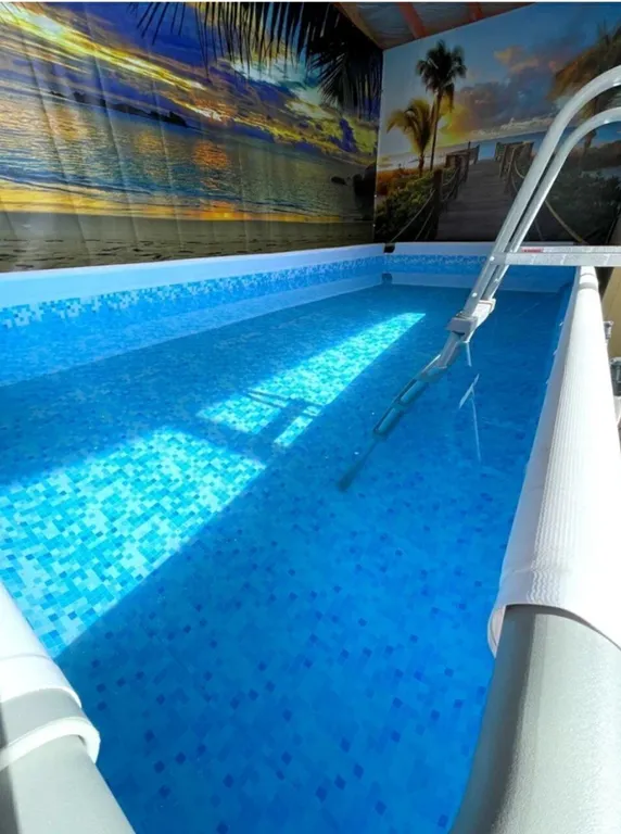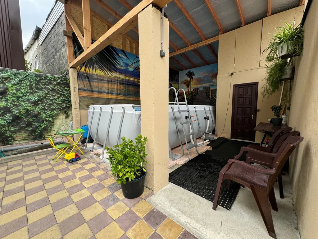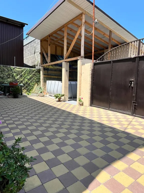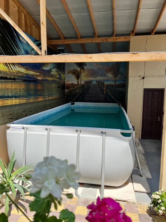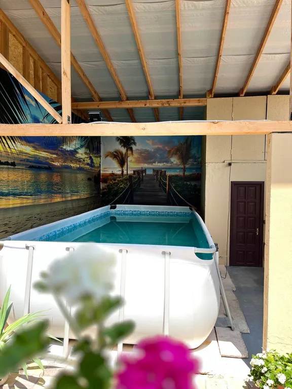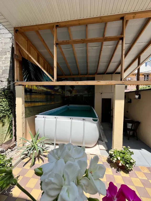 Территория дома ухожена и обустроена для отдыха: есть уличная мебель, мангал и все для барбекю, а также каркасный бассейн. Для вашего удобства предусмотрена общая кухня со всем